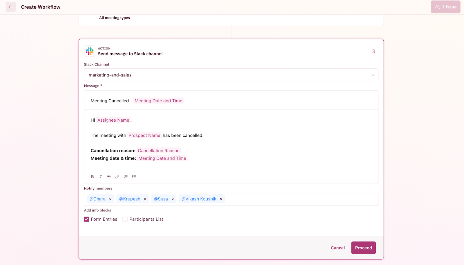 Make the Slack message actionable. Include a quick CTA, like check the contact, to prompt any additional, manual outreach if needed. This step transforms a canceled meeting from “lost” to “re-engagement opportunity”.